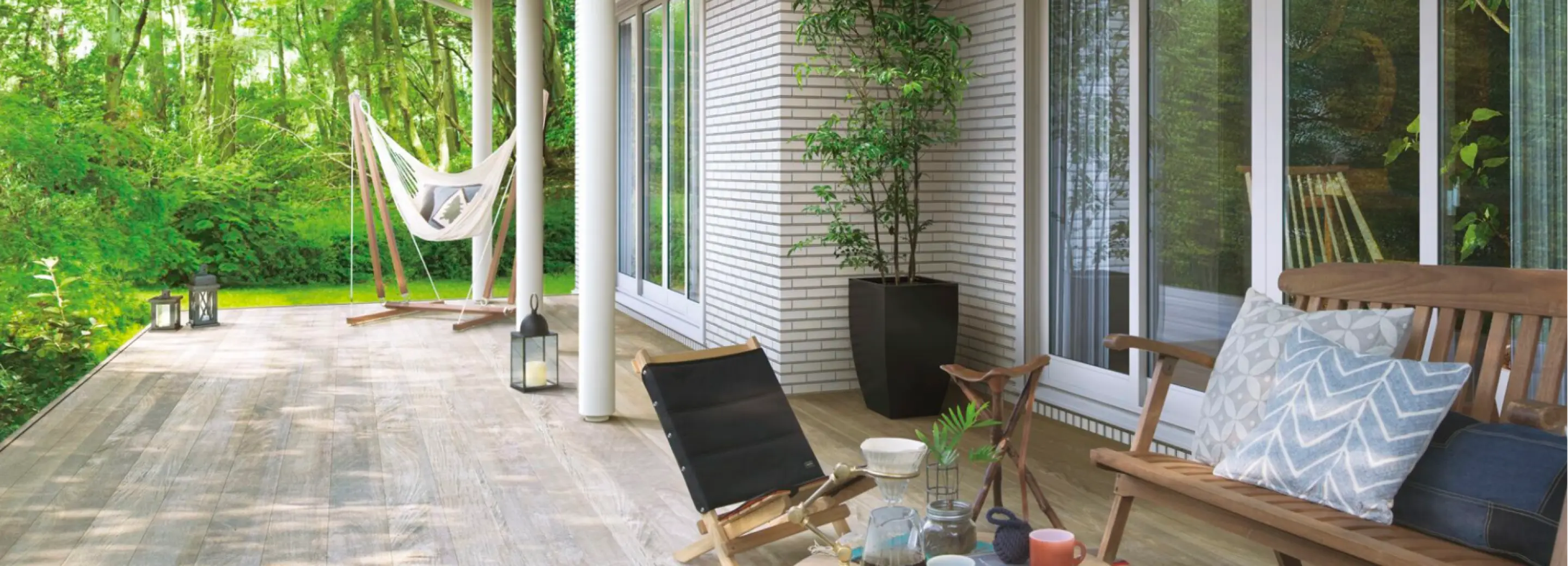 L字にした部分にはタイルデッキを設置。リビング・ダイニングにそれぞれ面した屋根の下の空間は、生活にゆとりをもたらします。