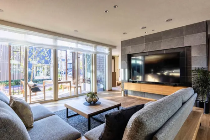 デッキに面した大きな窓から光と緑が差し込み、ほどよい“こもり感”と心地よい“ヌケ感”を同時に味わえる空間です。