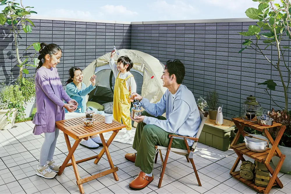 人目につかずおうちキャンプを楽しめるバルコニー。小屋裏納戸にグッズもしまえます。