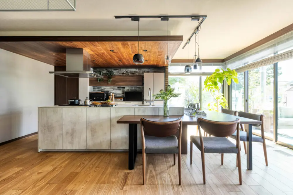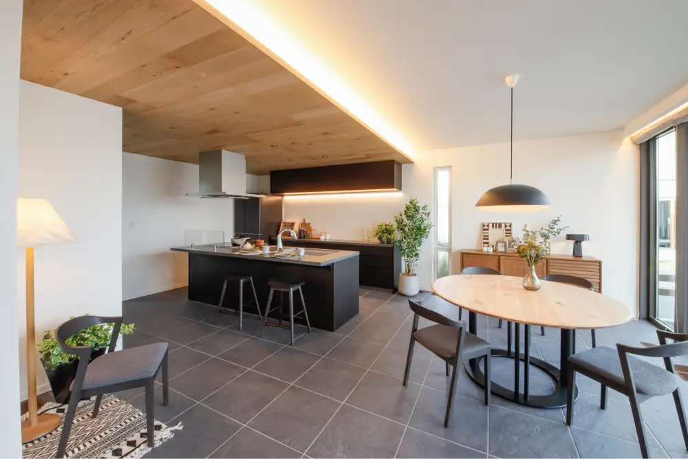 LDKの中心にキッチンを配置し、ダイニングにもリビングにも目が届きます。
