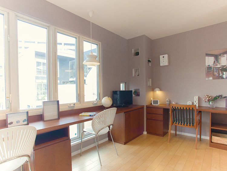 雑然としがちなスタディコーナーもリビングから離れた場所に置くことで、リビング・ダイニングをいつもきれいに保てます。